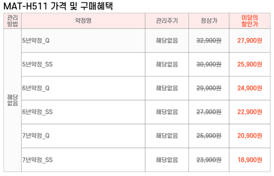 MAT-SH511,MAT-QH511 SK매직 [SK매직] 에코 휴 헤드보드 페브릭 브라운(슈퍼싱글,퀸,킹) 제품분류 침대 AS기간 렌탈기간내 최저 렌탈가 월 18,900 (렌탈가) 제휴카드 할인가 월 (렌탈가) 5년 6년 7년 슈퍼싱글 퀸 할인 제휴카드 보기 렌탈신청 장바구니