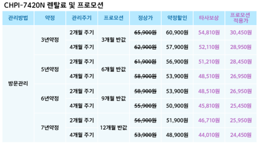 CHPI-7420N 코웨이 [코웨이] 아이콘 얼음정수기 맥스 제품분류 정수기 정수방식 직수형 타입 하프형 기능 얼음냉온 AS기간 렌탈기간내 최저 렌탈가 월 44,010 (렌탈가) 제휴카드 할인가 월 (렌탈가) 3년 5년 6년 7년 방문관리/4개월(타사보상) 방문관리/4개월 방문관리/2개월(타사보상) 방문관리/2개월 제품색상 선택 아이스화이트 + 0원 아이스블루 + 0원 아이스그레이 + 0원 할인 제휴카드 보기 렌탈신청 장바구니